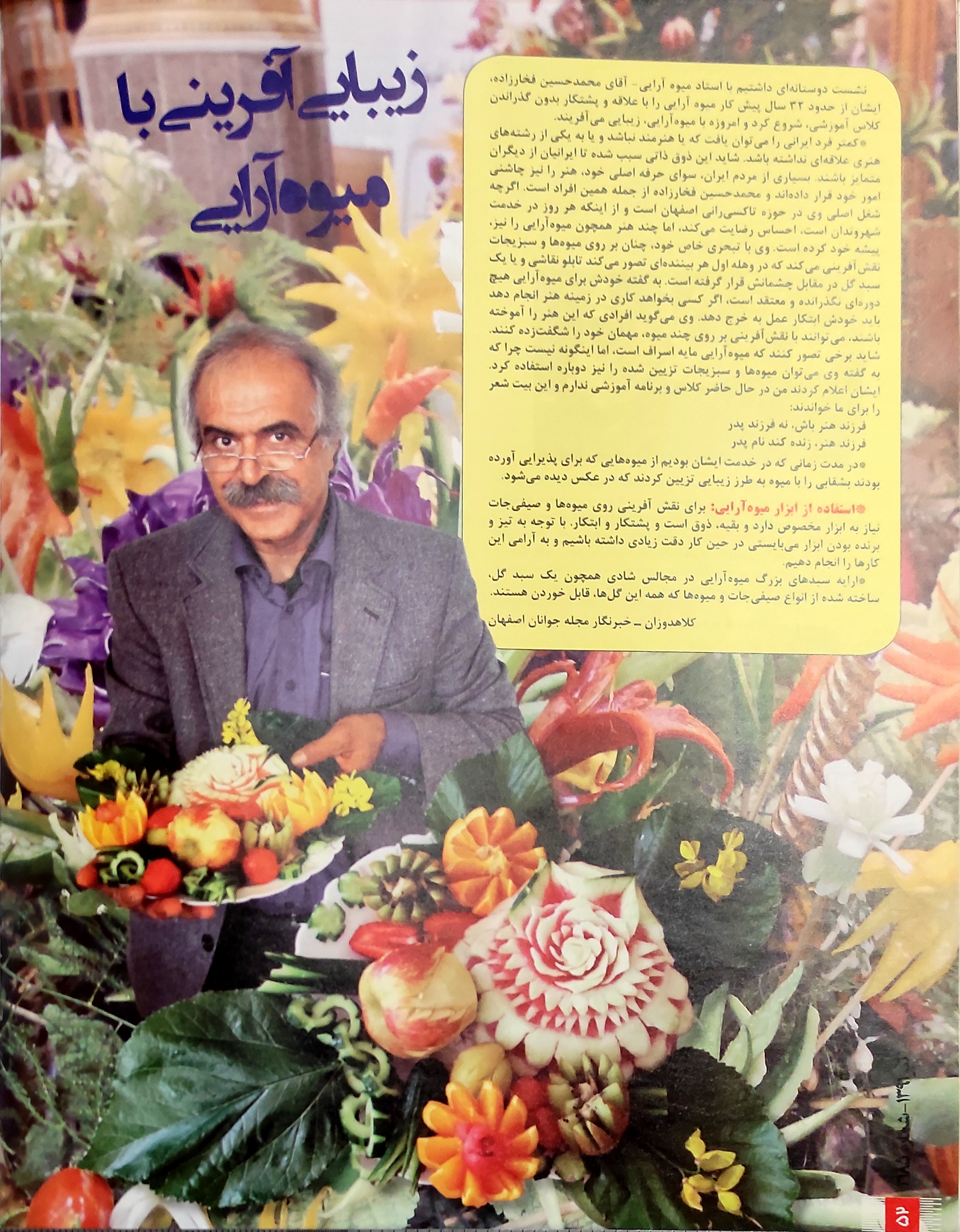 درتصویر زیر، بشقاب میوه تزیین شده را در دست استاد فخارزاده می بینید.